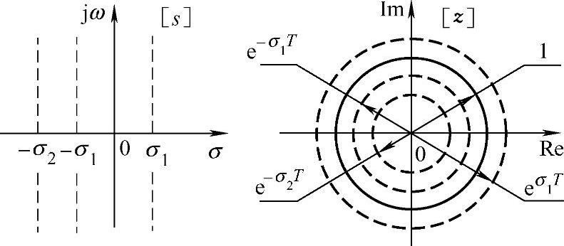 等衰减系数( σ 为常数)线从 s 平面映射到 z 平面上以原点为圆心,以 z =e σ T 为半径的圆,如图8-19所示。左半 s 平面上的等 σ 线映射为 z 平面上单位圆内的同心圆;右半 s 平面上的等 σ 线映射为 z 平面上单位圆外的同心圆。