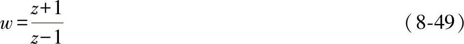 通过式(8-48),可将线性时不变离散系统在 z 平面上的特征方程 D ( z )=1+ G ( z )=0转换成在 w 平面上的特征方程 D ( w )=1+ G ( w )=0。于是,离散系统稳定的充分必要条件,由特征方程 D ( z )=1+ G ( z )=0的所有根位于 z 平面上的单位圆内,转换为特征方程 D ( w )=1+ G ( w )=0的所有根位于左半 w 平面。因此,与在 s 平面上应用劳斯稳定判据的情况一样,根据在 w 域中特征方程的系数,就可以应用劳斯稳定判据判断离散系统的稳定性,并相应地称为 w 域劳斯稳定判据。