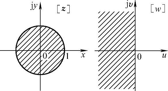 因此, u =0等价于 x 2 + y 2 =1,表明 z 平面的单位圆映射到 w 平面的虚轴; u <0等价于 x 2 + y 2 <1,表明 z 平面的单位圆内映射到 w 平面的左半平面; u >0等价于 x 2 + y 2 >1,表明 z 平面的单位圆外映射到 w 平面的右半平面。 z 平面和 w 平面的映射关系如图8-22所示。