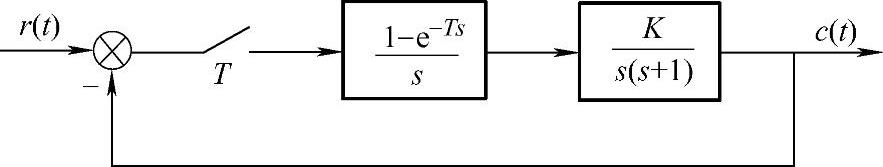 例8-18 设闭环离散系统如图8-23所示,当采样周期分别为 T =1s和 T =0.5s时,试求使系统稳定的 K 值范围。