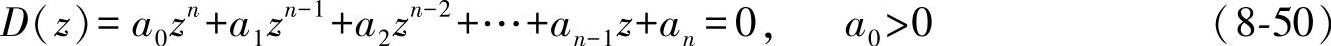朱利稳定判据:线性时不变离散系统稳定,即式(8-50)的闭环特征方程的根全部位于 z 平面上的单位圆内的充分必要条件为