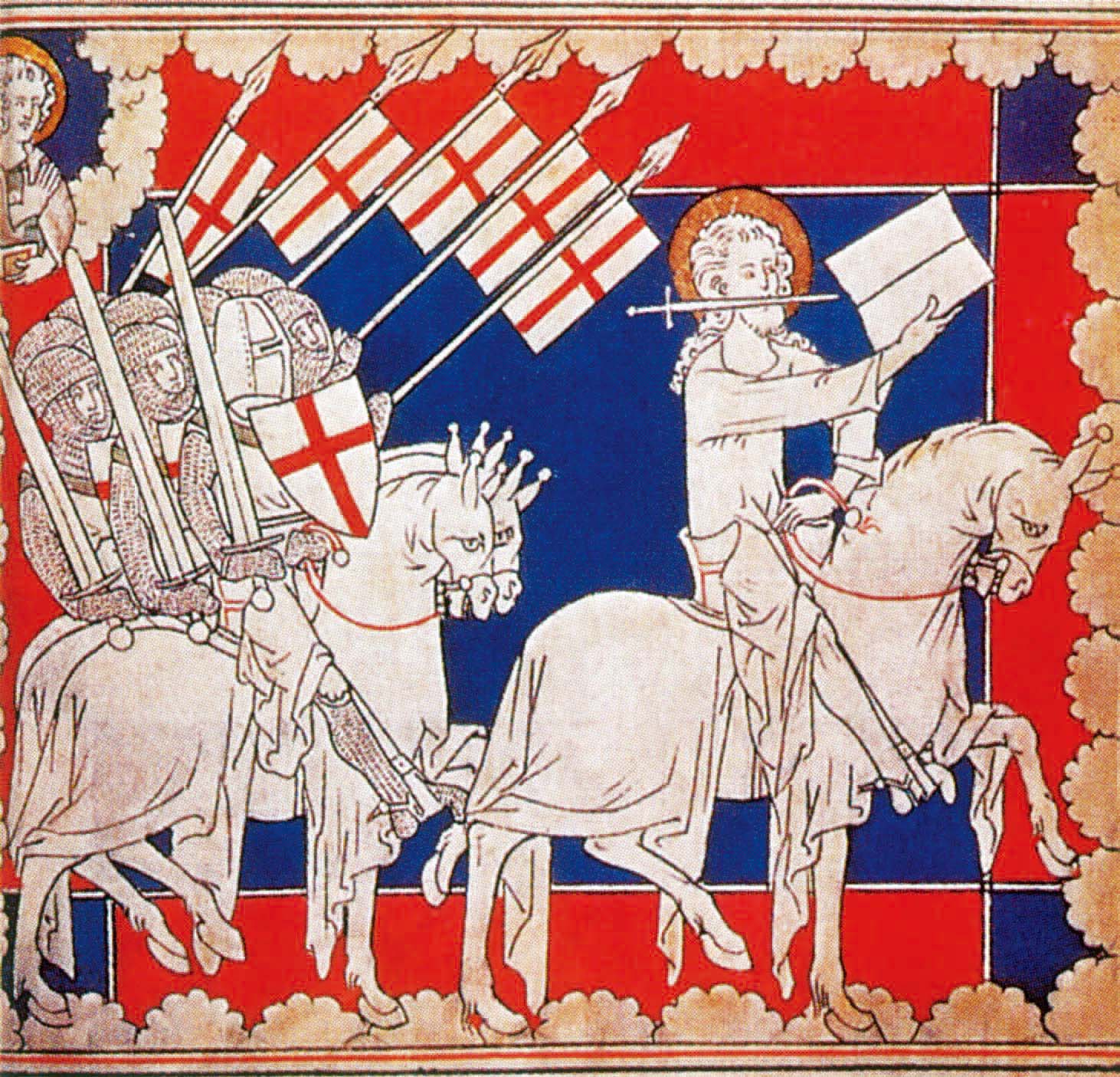 在这幅画作中,耶稣基督以剑和《圣经》引领着十字军军队。