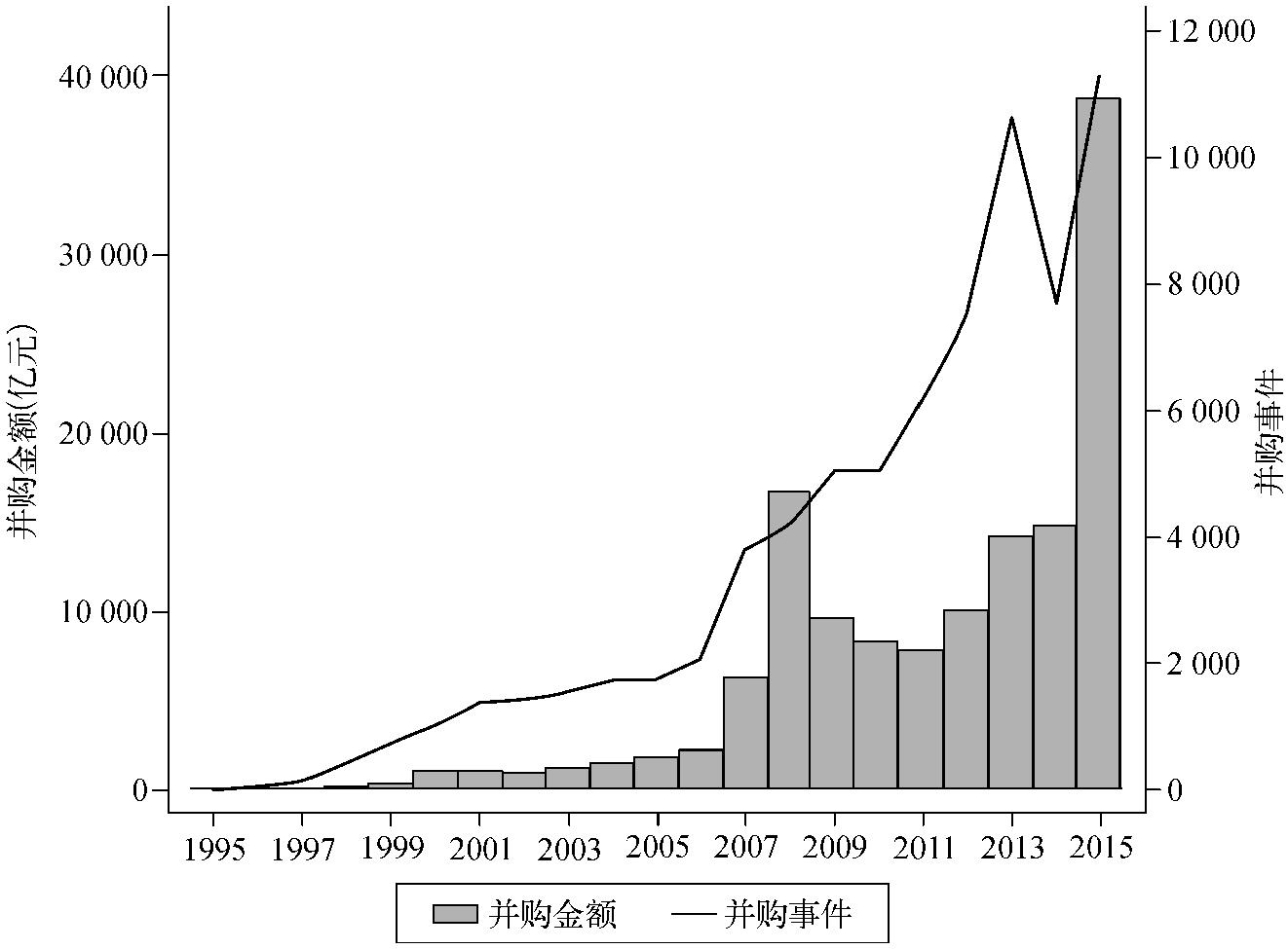 自1984年第一例企业并购开始,短短30年的时间,并购已经成为我国企业实现资源优化配置、改善经营管理、加快产业间整合以及提高经济效益的重要手段(苏毓敏,2015)。图1.1显示了我国1995~2015年间上市公司企业并购金额与并购事件数量的信息,无论从金额上还是从数量上看,我国上市公司企业并购数量在20年的观察期间均经历了一个明显的增长,尤其是2006年股权分置改革完成以后,我国企业发展进入了一个并购重组的高峰期。