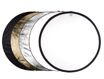 除了灯具设备之外,一些辅助照明设备也很重要,如柔光板、柔光箱、反光板、滤镜、调光器、色板等。如果是在室外进行一些大场景的拍摄,可以使用反光板辅助照明,如图2-14所示。反光板一般有5面,可以做到柔光、反光和吸光效果,轻便且补光效果好,在室外可以起到辅助照明的作用,也可作为主光使用。