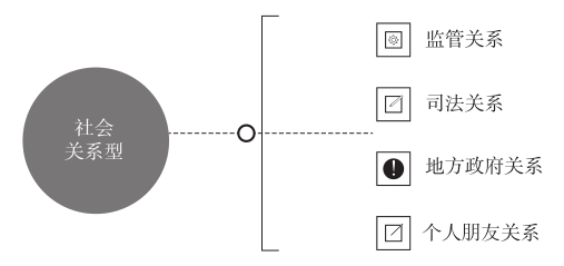 上市公司的经营和管理面临着比较复杂的社会环境,正确处理好上市公司与其所在地的党政机关的关系、监管关系、司法关系、与个别有影响力的个人的关系等社会关系才能确保上市公司稳健运行。而从事公司经营管理的高级管理人员,受精力和兴趣所限,有可能缺乏处理这些复杂社会关系的能力。此时,上市公司的大股东、实际控制人或者高级管理人员就会借用独立董事这个治理要素的岗位,吸引有社会资源的人员担任上市公司独立董事。也有人为了能担任上市公司独立董事,向大股东、实际控制人或者上市公司高级管理人员强调其拥有社会资源和社会关系,其在担任该上市公司的独立董事后也会自觉地将自己作此定位。社会关系型独立董事如图2-1所示。