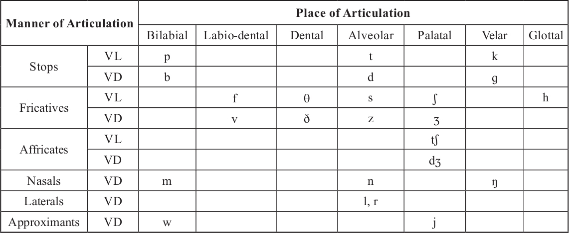 By manner of articulation, the English consonants can be grouped into stops, nasals, fricatives, approximants, laterals and affricates.In terms of place of articulation, consonants can be classified into bilabials, labio-dentals, dentals, alveolars, postalveolars, palatals, velars, and glottal.Two consonants sharing the same place and manner of articulation become a pair, which is distinguished by voiceless or voiced.(See the table below)