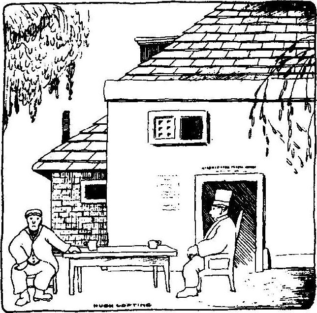 话说,当马戏团来到一个中等市镇演出时,一天傍晚,医生和马修·马格带着小狗汪汪出去散步。他们整天忙着安排马戏团演出,还没有机会看看市容。他们走过几条大街,来到一家酒馆,酒馆门口摆着些桌子椅子。这是个温暖的傍晚,于是医生和马修在酒馆门前的一张桌子旁边坐下,要了杯麦芽酒喝着。