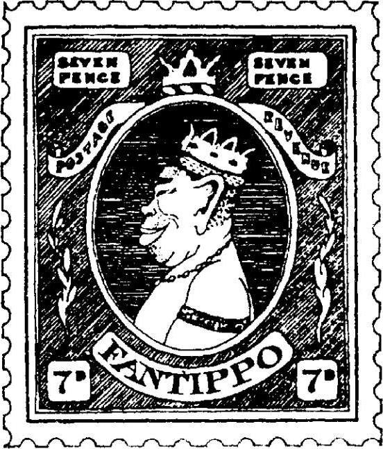 于是,范蒂波的科科国王,一个非常爱慕虚荣的人,制造了好多有他的像的邮票,有一些戴着王冠;有一些面带微笑;有一些板着脸;有一些骑马;有一些坐在自行车上。不过他最得意的是一张十便士的邮票,那上面有他打高尔夫球的像——这种玩意儿是他从一些在他这里采金矿的苏格兰人那里学会的。