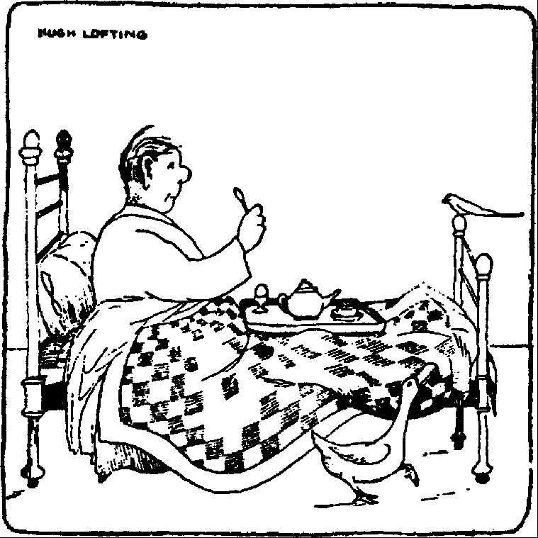 “了不起,奎普,”医生说,“我祝贺你。我必须起来了,我有许多许多工作要做。别忘了告诉飞箭,十点钟我在船上见它。再见!噢,你出去的时候,请告诉呷呷来拿早餐的托盘好吗?我很高兴你来,你给了我一个主意。再见!”