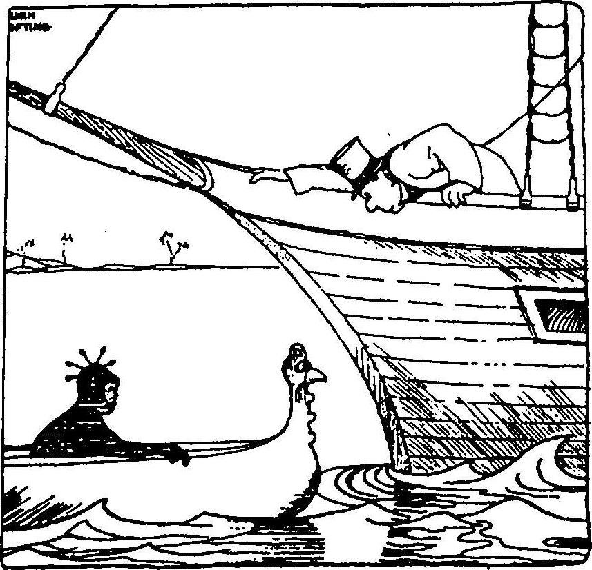 于是,约翰·杜利特到甲板上去掌舵,让船跟着那些带路的燕子行驶。很快他就看到一只黑色的小划子在海浪上一起一落,在茫茫大海上它显得那么小,就如同是一块木头或者一根棍子——不靠近看根本就看不出它来。小划子里坐着一个女人,把头伏在了膝盖上。