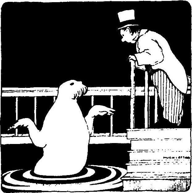 这天早晨——还很早——当医生来到它的帐篷时,它的管理员正在外面台阶上吃早饭。里面,一个直径约十二英尺的水槽嵌在地里,水槽周围是有栏杆的平台,观众就站在那上面看演出。索菲,一只五英尺长的漂亮的阿拉斯加海豹,皮肤光滑,眼睛灵活,正在水槽的水里闷闷不乐地吞吃东西。当医生用它的语言跟它说话时,它才知道来看它的人是谁了,一下子泪流如雨。