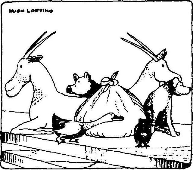 大篷车的门打开,他看到医生带来的那群奇怪动物,似乎感到非常惊奇——对小猪尤其感到吃惊。不过有了“你推我拉”,他太高兴了,也就不在乎这些了。