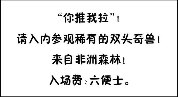 布洛塞姆想马上就让“你推我拉”供人参观,可是医生反对。他说从泥潭镇一路到这里,任何一只野生动物都会需要休息一下的。他希望这只胆小的野兽在被一大群一大群的人参观之前,先习惯一下马戏团的吵吵闹闹的生活。