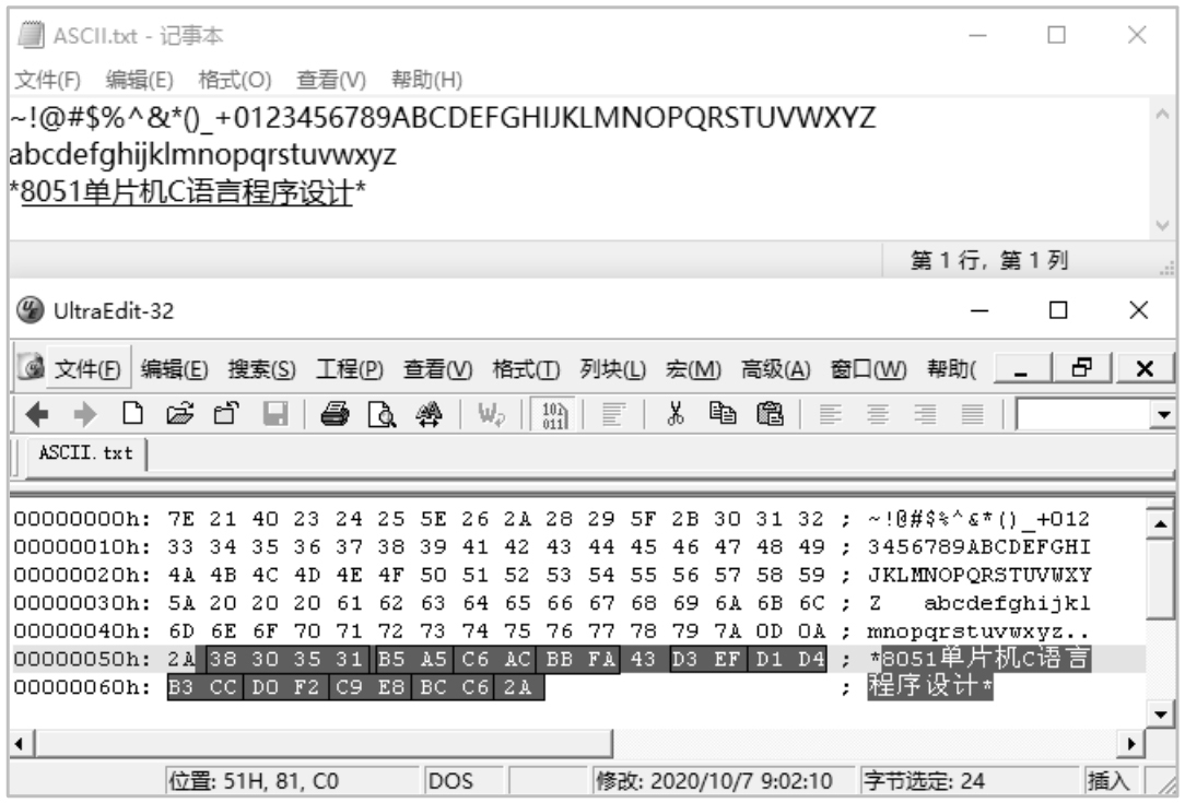 用NotePad与UltraEdit获取字符编码如图1-15所示。从图1-15中可以看到,用NotePad输入的字符(包括中文字符)以及在UltraEdit中查看的十六进制字符编码的效果。UltraEdit不仅显示了所输入英文数字等字符的ASCII编码(小于0x80),而且显示了所输入汉字的内码。例如,“8051单片机C语言程序设计”的编码为“ 38 30 35 31 B5 A5 C6 AC BB FA 43 D3 EF D1 D4 B3 CC D0 F2 C9 E8 BC C6”。在图1-15的标底色编码部分,除“ 38 30 35 31 ”与“ 43 ”为数字与英文半角字符“8、0、5、1、C”的编码以外,其他编码全部大于或等于0xA0,且每两字节(汉字内码)表示一个汉字。8051单片机虽然支持在源程序中直接使用中文字符串或中英文混合字符串,且偶尔会编译正常通过,但实际运行时却会出现异常的情况,此时可考虑将中文字符串以编码(汉字内码)的方式提供。