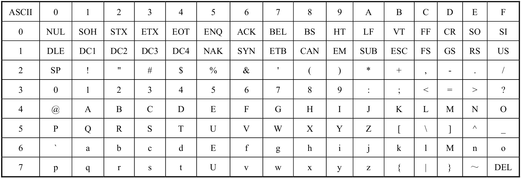 在设计英文或数字等字符(字符串)显示程序或串口收发信息等程序时,必须熟悉标准的ASCII编码表。ASCII编码(0x00~0x7F)如表1-12所示。由表1-12可知: