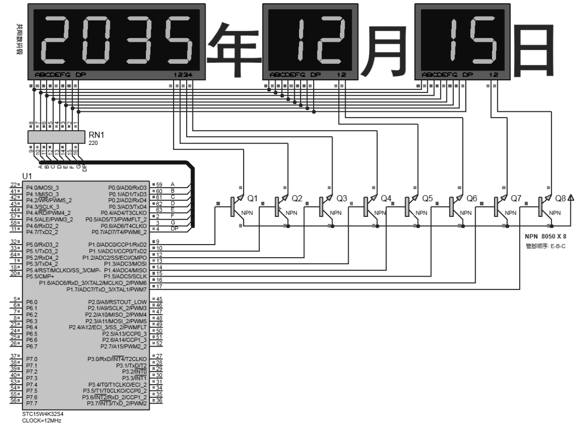 集成式数码管动态扫描显示电路图3-7所示。在该仿真电路运行时,集成式数码管“同时”显示多个不同字符。本案例程序设计使用了集成式数码管动态扫描显示技术。为将年、月、日的显示分开,在该仿真电路中未使用元器件库提供的8位集成式共阳数码管,而是选用了一组4位及两组2位的共阳集成式数码管,并将其拼装成一组“8位集成式”数码管。在拼装时,要注意“段引脚并联、位引脚分立”。