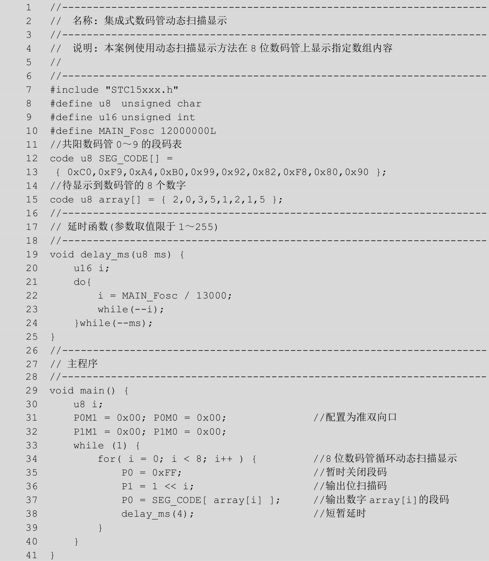 本案例程序使用了方法2列出的数码管扫描方法,通过单条语句实现动态扫描显示。