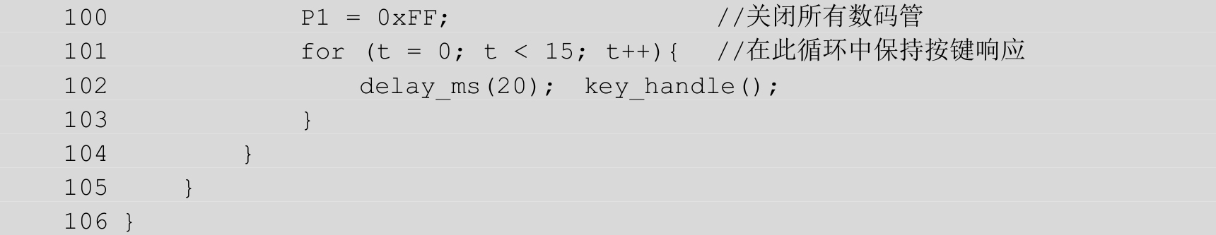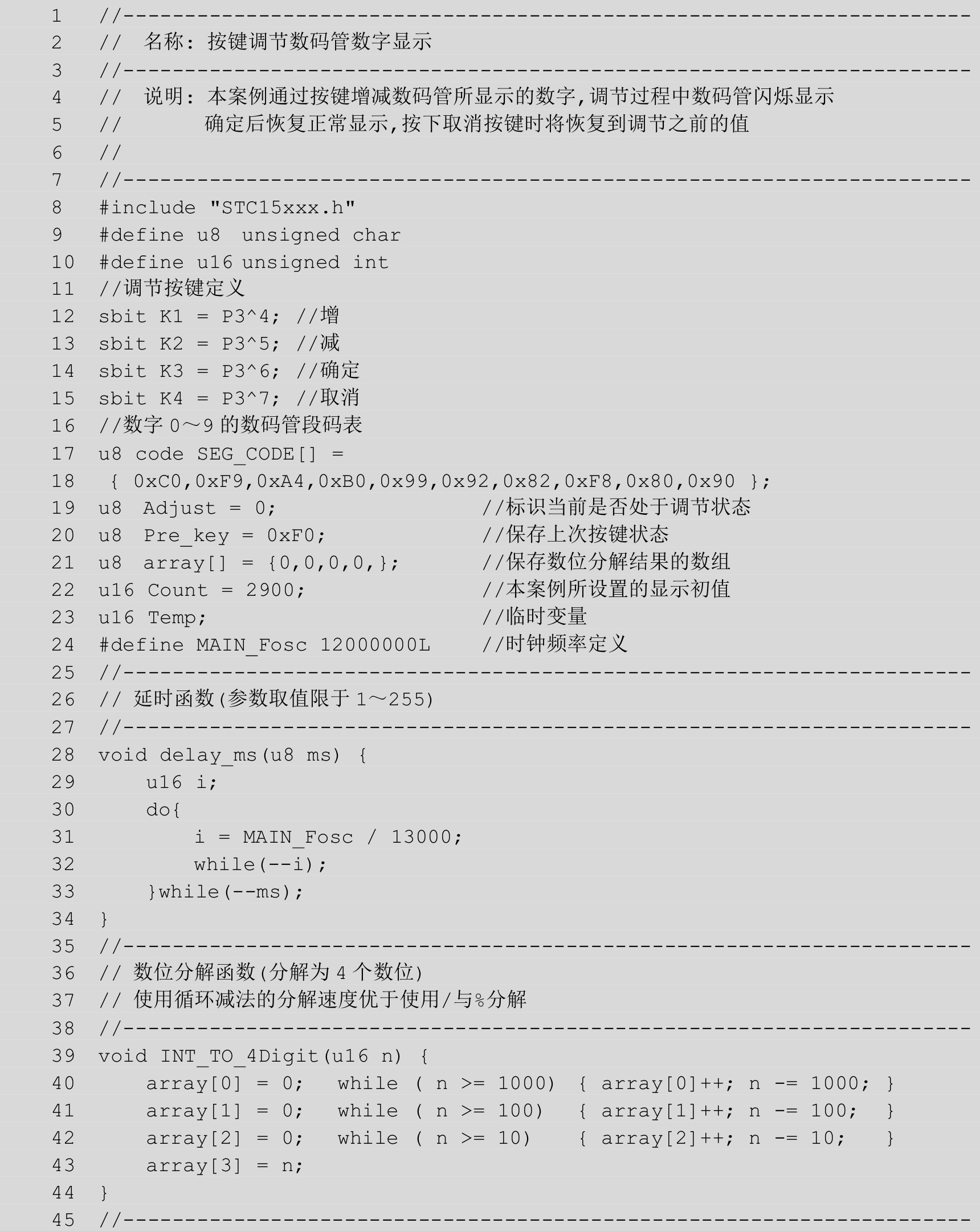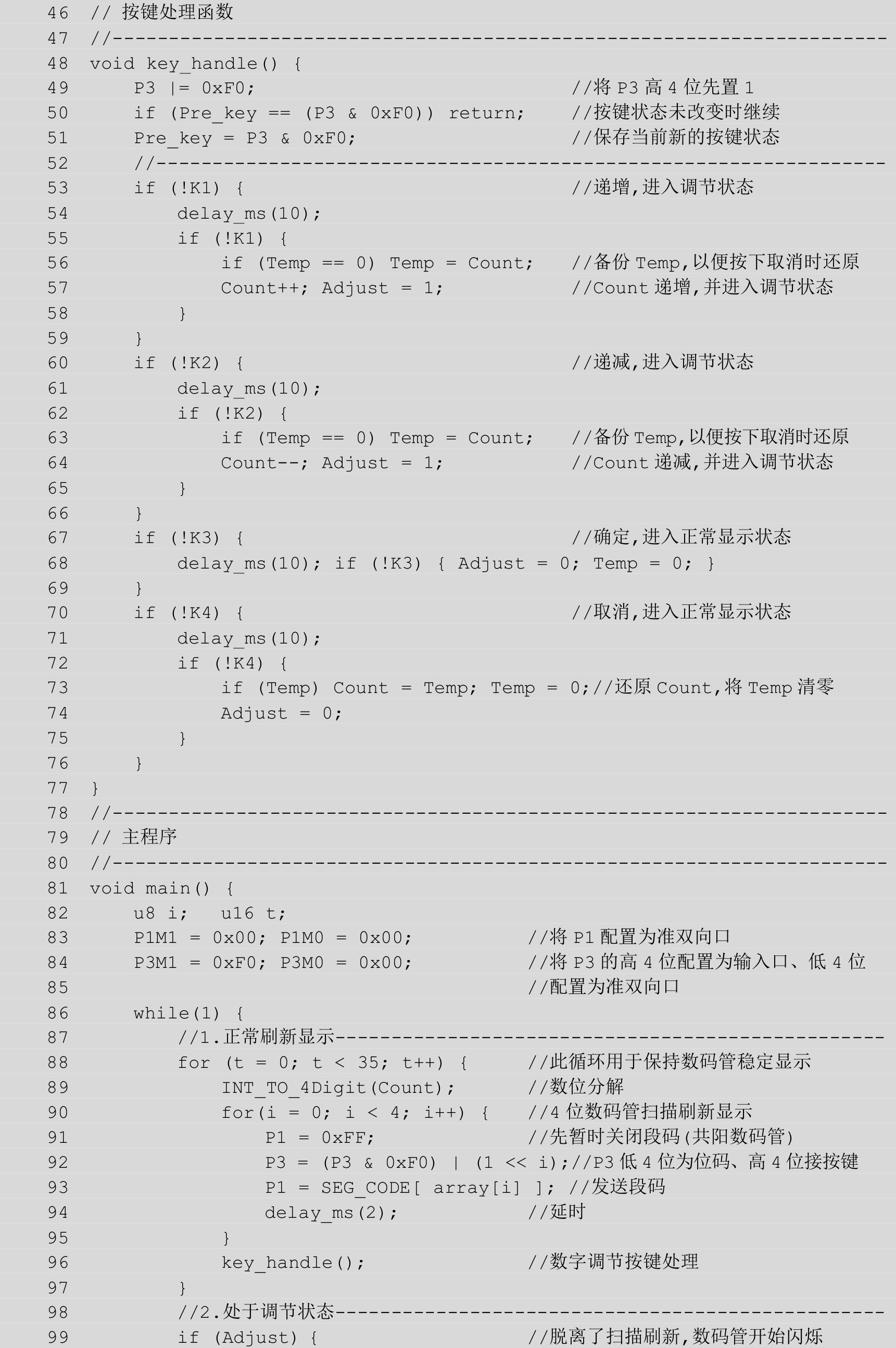 为实现增、减调节时数码管的闪烁显示效果,本案例程序使用了Adjust变量。如果该变量为1,则表示进入调节状态,主循环内第二部分中的15次循环及延时在跟踪按键操作的同时,由于延时达150ms,使数码管出现闪烁现象。主循环内第一部分内的循环次数越大(本案例设为35),每150ms的黑屏显示后的正常稳定显示时间就越长,否则正常稳定显示时间越短。