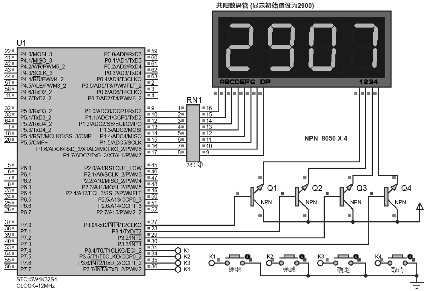 按键调节数码管闪烁增减显示电路图3-8所示。在该仿真电路运行时,可通过4个按键分别实现数字增、减调节,确定及取消调节功能。在调节过程中,数码管将闪烁显示,确定后恢复正常显示,按下取消按键时将恢复到调节之前的值。