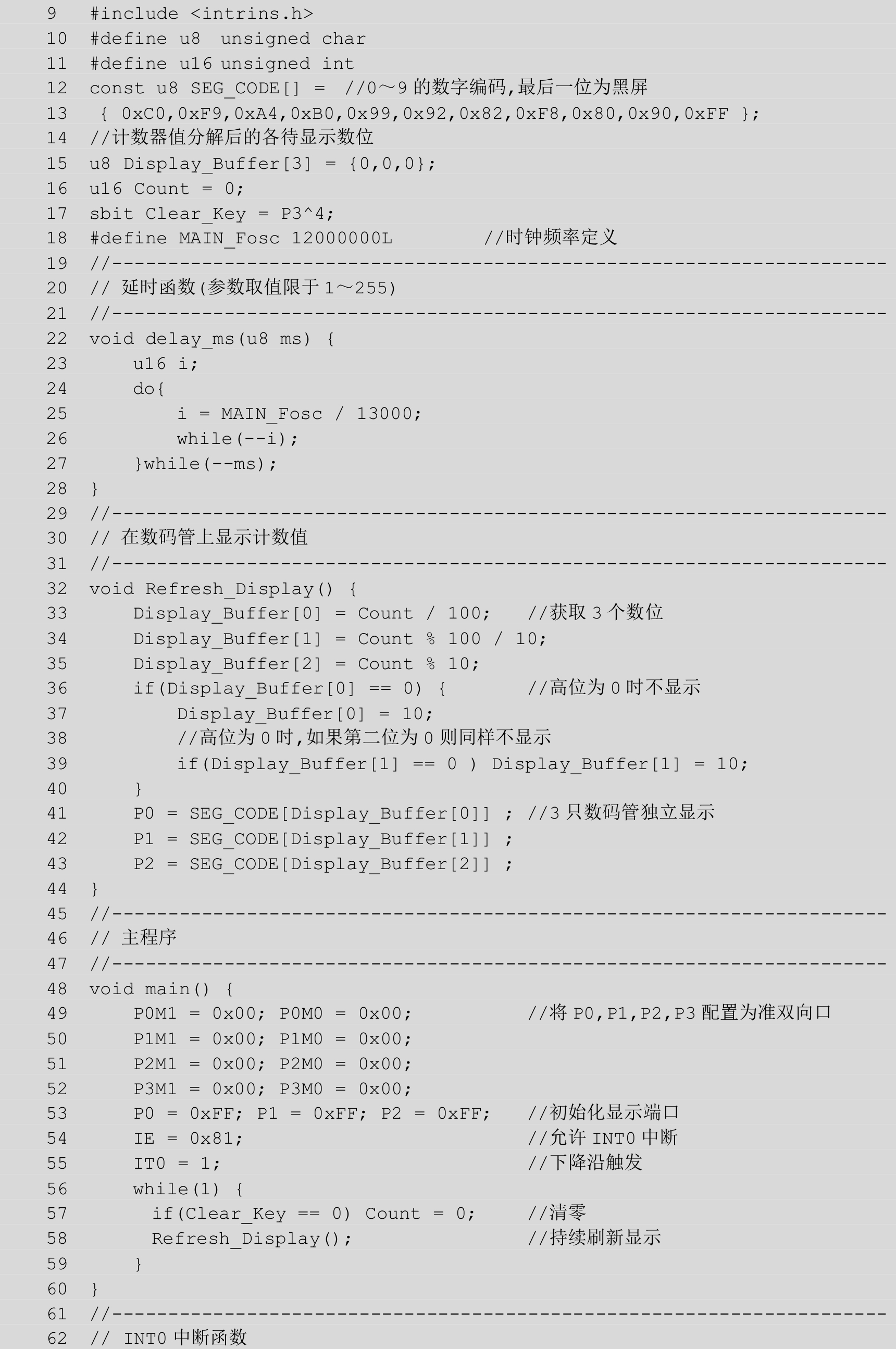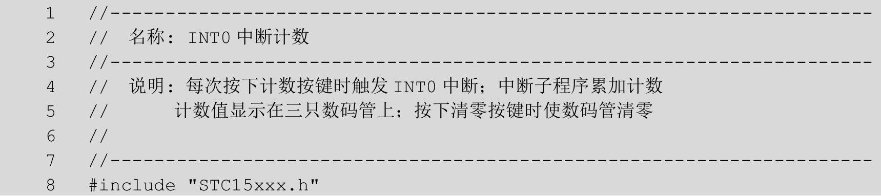 主程序中所设置的IT0(Interrupt Trigger INT0)是TCON寄存器中控制INT0中断方式的设置位。对于STC15,设置IT0I1将INT0的中断触发方式设置为仅下降沿触发INT0/P3.2引脚,而设置IT0=0则为表示上升沿与下降沿均可触发INT0/P3.2引脚。本案例选择下降沿触发INT0/P3.2引脚,即当按下计数按键时,在P3.2引脚信号由高电平到低电平的跳变将触发INT0中断;如果按下计数按键后没有释放,INT0中断不会被持续触发,只有在释放计数按键后再次按下该按键时,才会因为又出现了高电平到低电平的跳变而再次触发INT0中断。这样的设置会使计数值仅在计数按键每次重新被按下时累加。