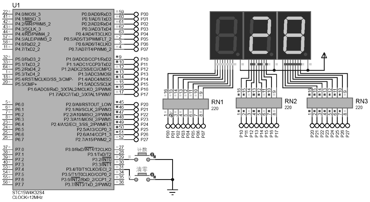 在仿真电路中用3只分立式数码管显示按键计数值,由于它们各自分立,对它们无须处理数码管动态扫描刷新显示问题。前面有关案例已涉及按键处理功能,图3-12中的清零按键控制方式与之类似,但计数按键则使用了新的外部中断技术。