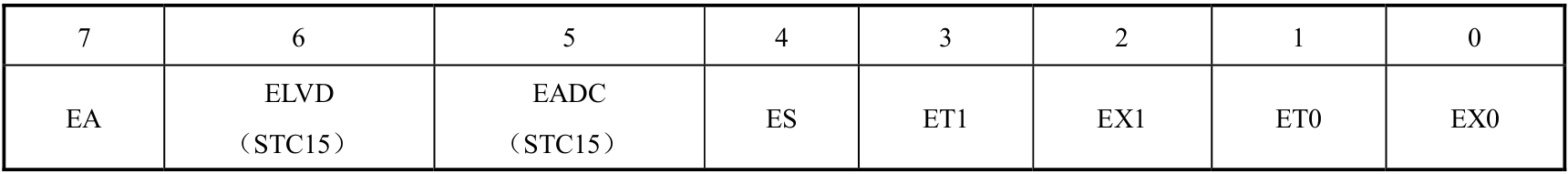 中断使能寄存器IE(Interrupt Enable Register)如表3-3所示。其中,右边第0~4位为EX0,ET0,EX1,ET1,ES,它们分别独立使能或禁止INT0,TIMER0,INT1,TIMER1及串口中断,对EX0,ET0,EX1,ET1,ES置1,则使能这些中断,置0则禁止这些中断;最高位EA用于一次性开启所有使能的中断或屏蔽所有中断。STC15的IE寄存器增加了ELVD与EADC,分别为低压检测中断允许位和A/D转换中断允许位。