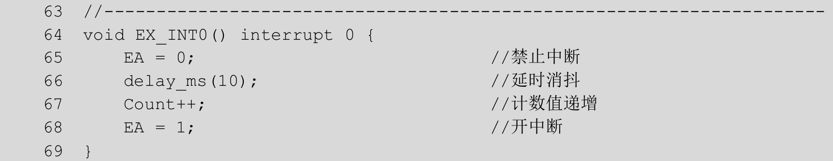 为使计数按键能够稳定地操作,在实物电路上测试时注意在程序中添加消抖语句。计数按键是通过中断触发来识别的,每次中断触发时即表示计数按钮被按下,中断子程序EX_INT0被自动调用,全局变量Count随之累加,INT0中断号为0,中断函数用interrupt指明中断号0。
