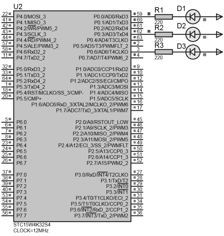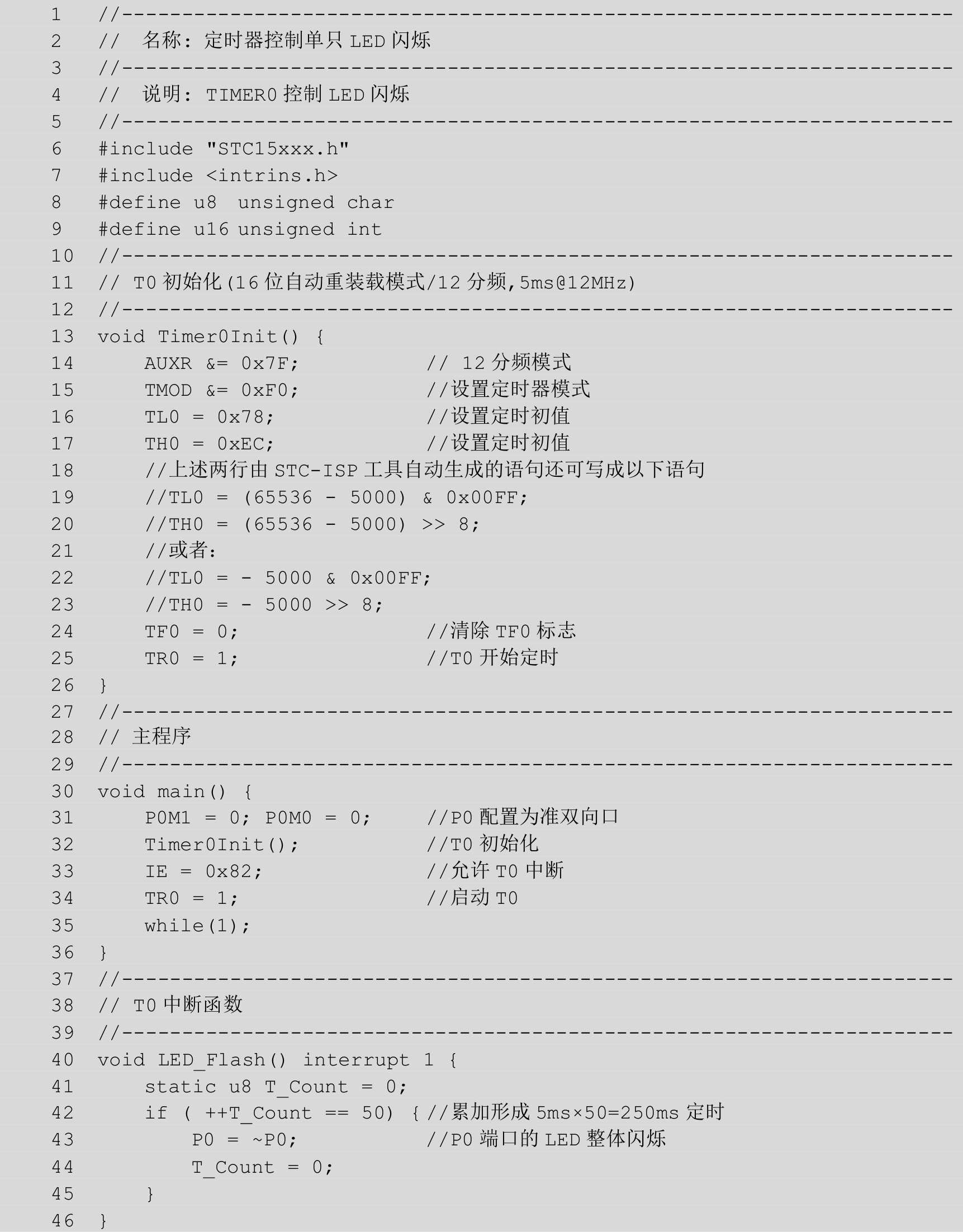 此前有关单只或多只LED闪烁的程序设计均使用延时子程序使LED按一定延时亮或灭,形成闪烁效果。图3-15所示电路则通过TIMER0定时器实现了对LED的闪烁控制。TIMER0通常简称为T/C0或T0。
