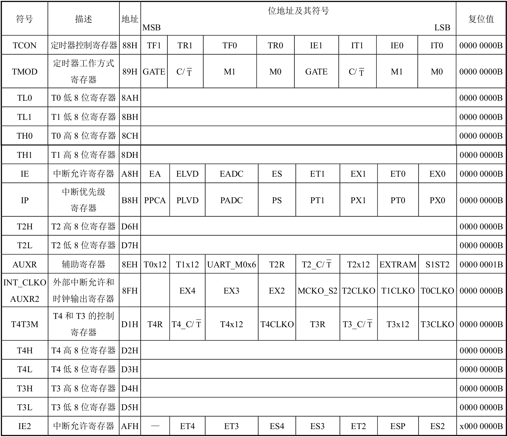 传统型8051单片机仅有2个16位定时/计数器T/C0与T/C1(简称T0与T1)。STC15W4K32S4单片机内置了5个16位定时/计数器:T/C0~T/C4(简称T0~T4)。T0~T4均可工作于计数方式或定时方式。表3-5给出了STC15的定时/计数器相关寄存器。