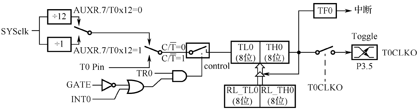 对于STC15的T0,其技术手册推荐使用其模式0,即16自动重装载模式。16位的最大值为2 16 -1=65 535,计数至65 536时溢出,其16位的原始值将被恢复,计数重新开始。图3-16给出了STC15的T0模式0的工作原理。