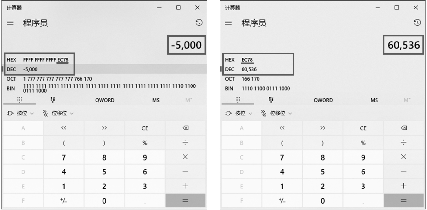 之所以可直接使用“负数”,是因为65 536即17位二进制数1 0000 0000 0000 0000的最高位为1,其余16位为0。对于16位的寄存器,65 536与0是相等的。为检验这一结果,可打开Win10附件中的计算器,切换到“程序员”模式,如图3-18所示,选择DEC(十进制),计算“65 536-5 000”,得到的结果为60 536;对应HEX(十六进制)的结果为EC78,即TL0=0x78,TH0 T 0xEC;如果输入“0-5 000”,可得结果为-5 000,即十六进制数FFFF FFFF FFFF EC78。其末尾数位同样为EC78,所得结果中仅有EC78(共4个十六进制位,也就是共16位二进制位)被分别保存到两个8位的寄存器TH0与TL0。