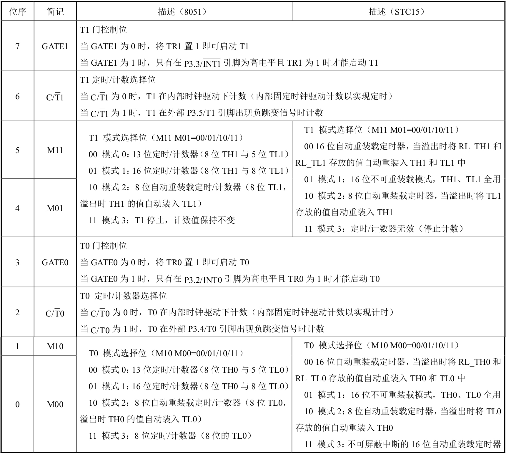 对于T0与T1,无论是STC15系列单片机,还是在传统型8051单片机,其工作方式均由TMOD寄存器配置,但两者的模式配置并不完全相同。T0、T1模式寄存器TMOD如表3-6所示。