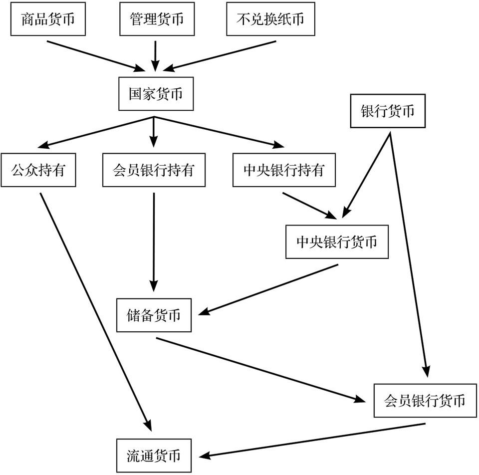 我的观点与流行的看法不完全相同,我认为国家货币不仅包括强制发行的法定货币 (法币) 本身,还包括国家或中央银行承诺支付过程中认可的货币,或承诺可兑换强制性法币的货币。 所以大部分现代纸币,连中央银行存款也计算在内,都归为国家货币;而银行货币 (或非法定货币) 目前主要包括会员银行存款。 纵观历史,大多代用性国家货币都是由某种银行货币演变而来的。国家采用这种银行货币之后,其性质发生了改变,从一个类别转到了另一个类别。