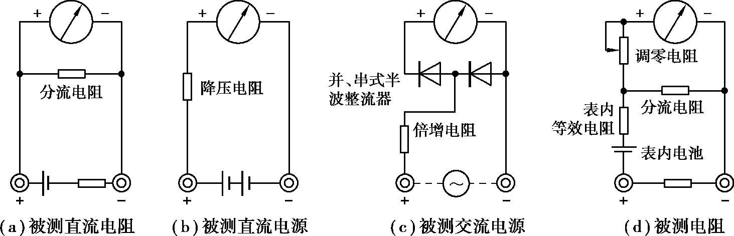 如图 1.17(d)所示,在表头上并联和串联适当的电阻,同时串接一节电池,使电流通过被测电阻,根据电流的大小,就可测量出电阻值。改变分流电阻的阻值,就能改变电阻的量程。