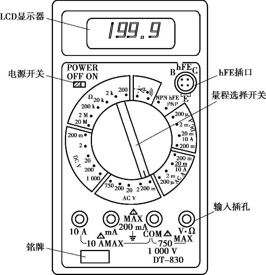 数字式万用表(图 1.16)是利用一只灵敏的磁电式直流电流表(微安表)作表头。当微小电流通过表头,就会有电流指示。但表头不能通过大电流,所以,必须在表头上并联和串联电阻进行分流或降压,从而测出电路中的电流、电压和电阻。