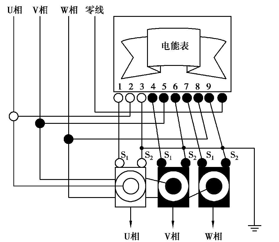 三相四线有功电能表的接线方法如图 1.20 所示,三相四线有功电能表经电流互感器接入,相线U、V、W分别穿过电流互感器电能表 1、4、7 端分别接电流互感器二次侧首端S 1 ,电能表 3、6、9 端分别接二次侧末端S 2 ,电能表 2、5、8 端分别接电流互感器的相线U、V、W,其连片应拆下。为保证安全,电流互感器二次侧末端S 2 应分别接地。