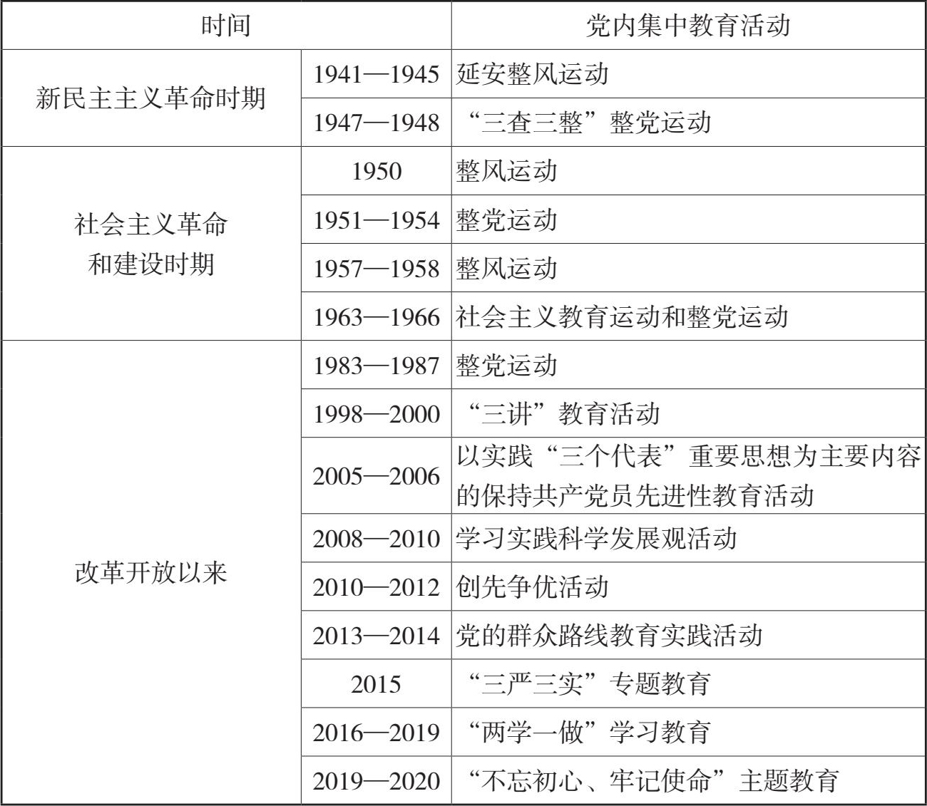 经常性教育与集中教育是一项制度安排。在中国共产党历史上,通过各种制度安排开展了多种形式的教育活动。1921年中国共产党刚成立时,年幼的党通过政治理论学习、民主讨论以及思想宣传等方式来开展党员教育活动。1923 年 11 月,中共中央发出的《教育宣传问题决议案》中强调了党内教育情况的报告制度,主要内容是要求各地党组织定期开展“政治讨论”,并在讨论过后依据实事求是精神,以及根据学习讨论的现实情况向中央提交讨论报告。1935 年遵义会议之后,党员教育活动开始变得相对规范化起来。1939 年 2 月 17 日,中共中央书记处发出《关于成立干部教育部的通知》,其中指出要针对在职干部进行脱产式集中教育,极大地提升了干部的能力与素质。20 世纪 40 年代党中央开创的整风运动以及之后关于加强党的建设的各种活动,如 1947—1948 年的整党运动等。中华人民共和国成立之后,1950 年全党全军开展了整风运动,1951—1954 年开展了整党运动,1957—1958 年开展了整风运动。在改革开放之后,1983—1987 年开展了整党运动,1998—2000 年开展了“三讲”教育活动等。进入 21 世纪,我们党同样非常重视经常性教育与集中教育的重要意义并有计划地开展,2004 年出台了《关于在全党开展以实践“三个代表”重要思想为主要内容的保持共产党员先进性教育活动的意见》,在这一重要文件中明确指出:“坚持经常性教育与适当的集中教育相结合,是我们党解决自身存在问题、加强自身建设的一条重要经验。”