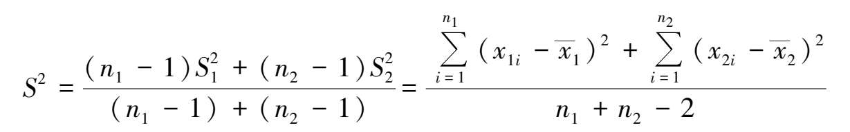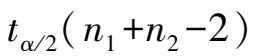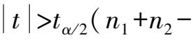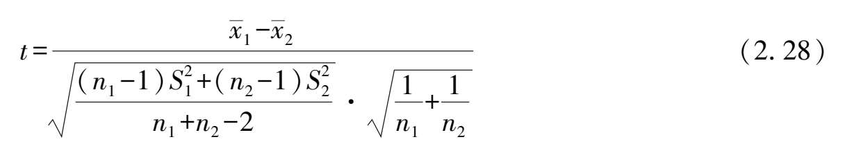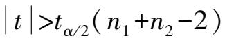 若原假设 H 0 成立,可以证明,统计量 t 服从自由度为 n 1 + n 2 -2 的 t 分布,因此给定置性度 α 下进行 t 检验。