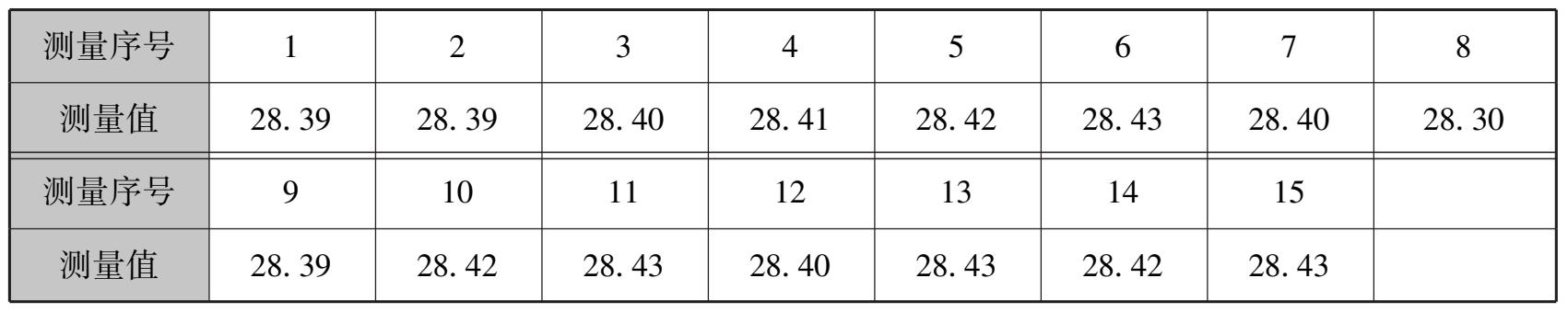 【例3.3】 对某物理量进行 15 次等精度测量,测量值为:28.39,28.39,28.40,28.41,28.42,28.43,28.40,28.30,28.39,28.42,28.43,28.40,28.43,28.42,28.43;试用拉伊特方法判断该测试数据的坏值,并剔除。