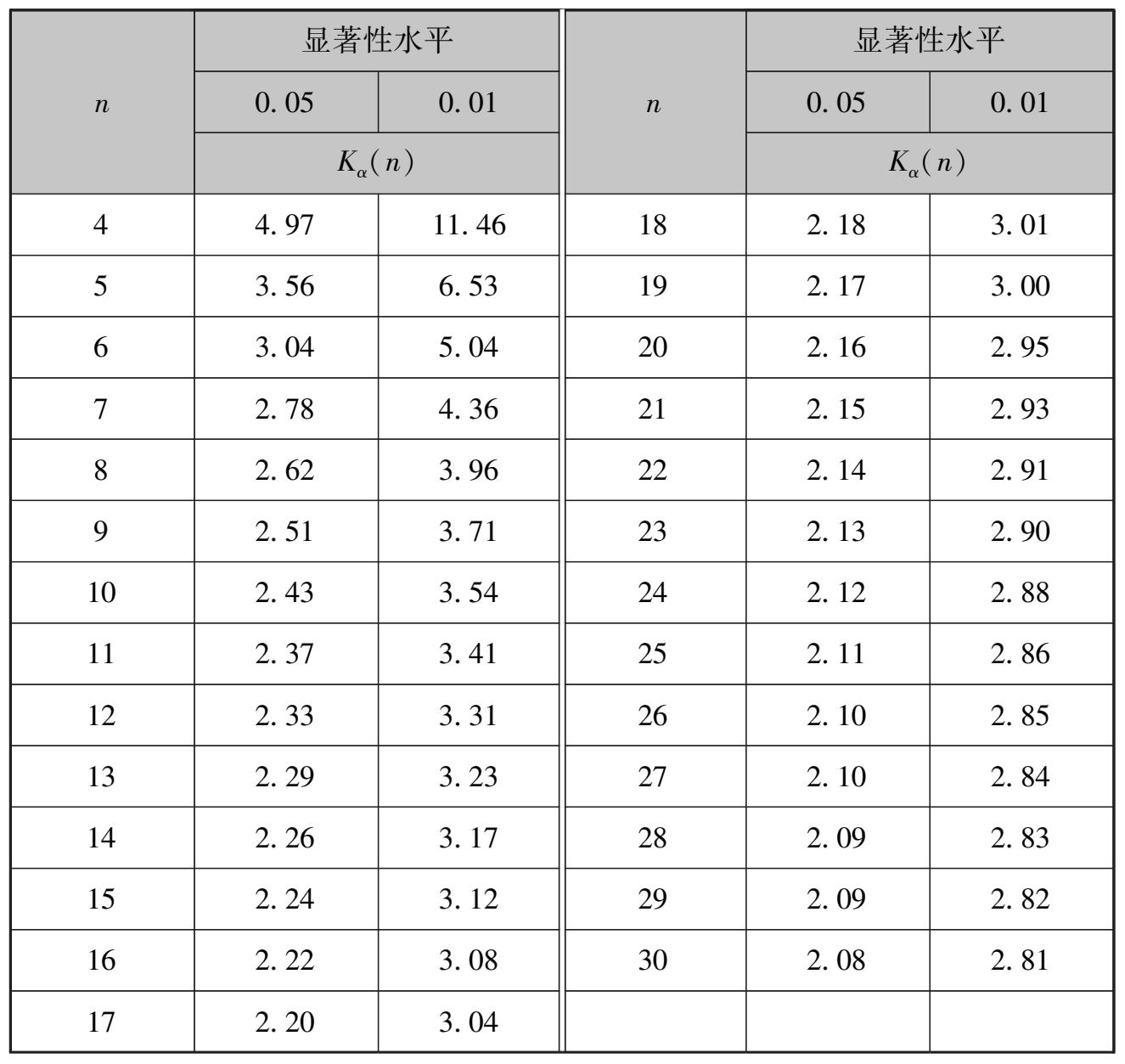 根据测量次数 n 和选定的显著性水平 α ,即可由表(3.7)查得 t 检验系数 K α ( n ),若