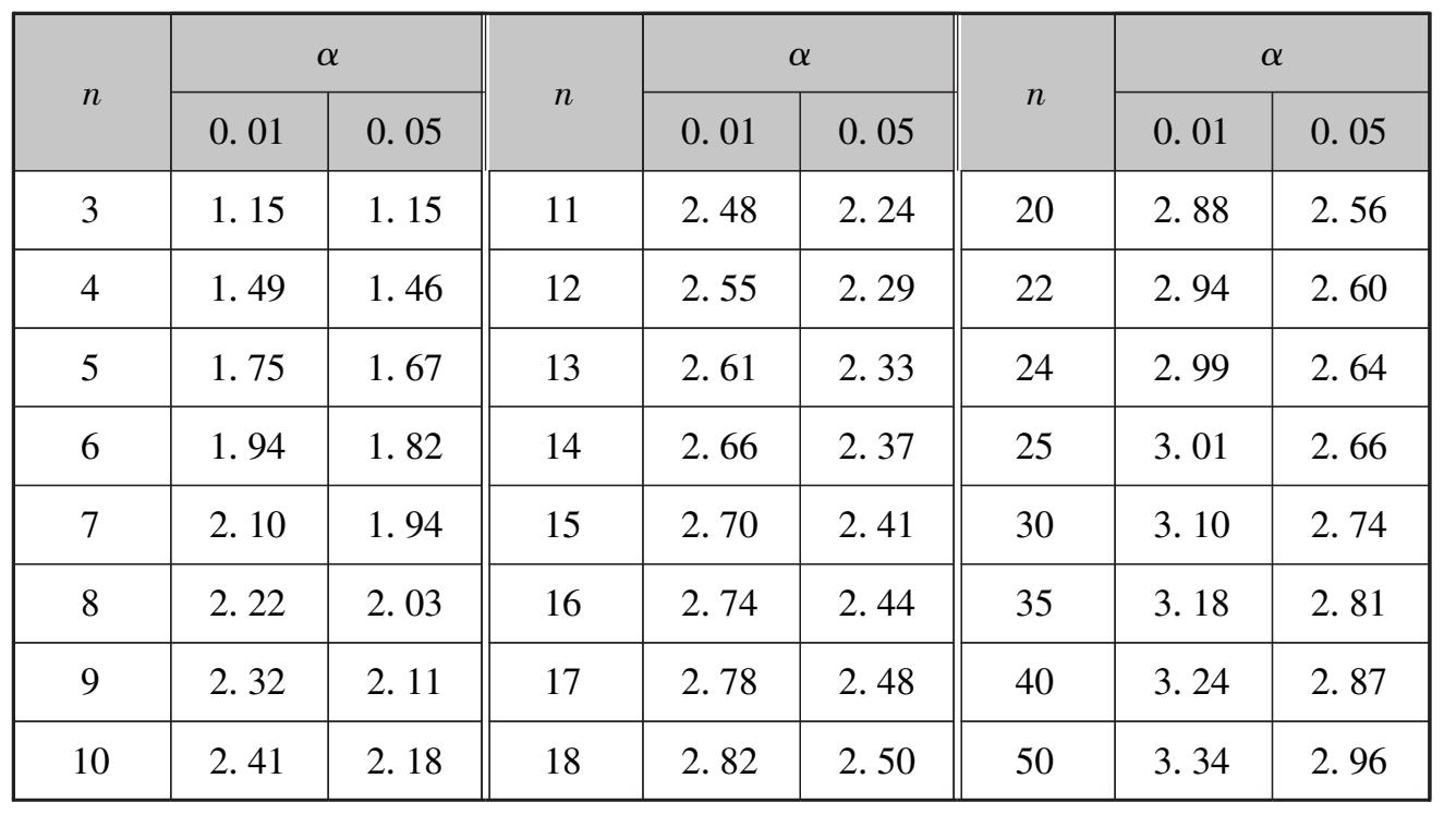 ③从表中查取 k ( α , n )。其中 α 为显著性水平,表示检验出错的概率 α = 0.01,0.05;1- α 置信度,置信水平。