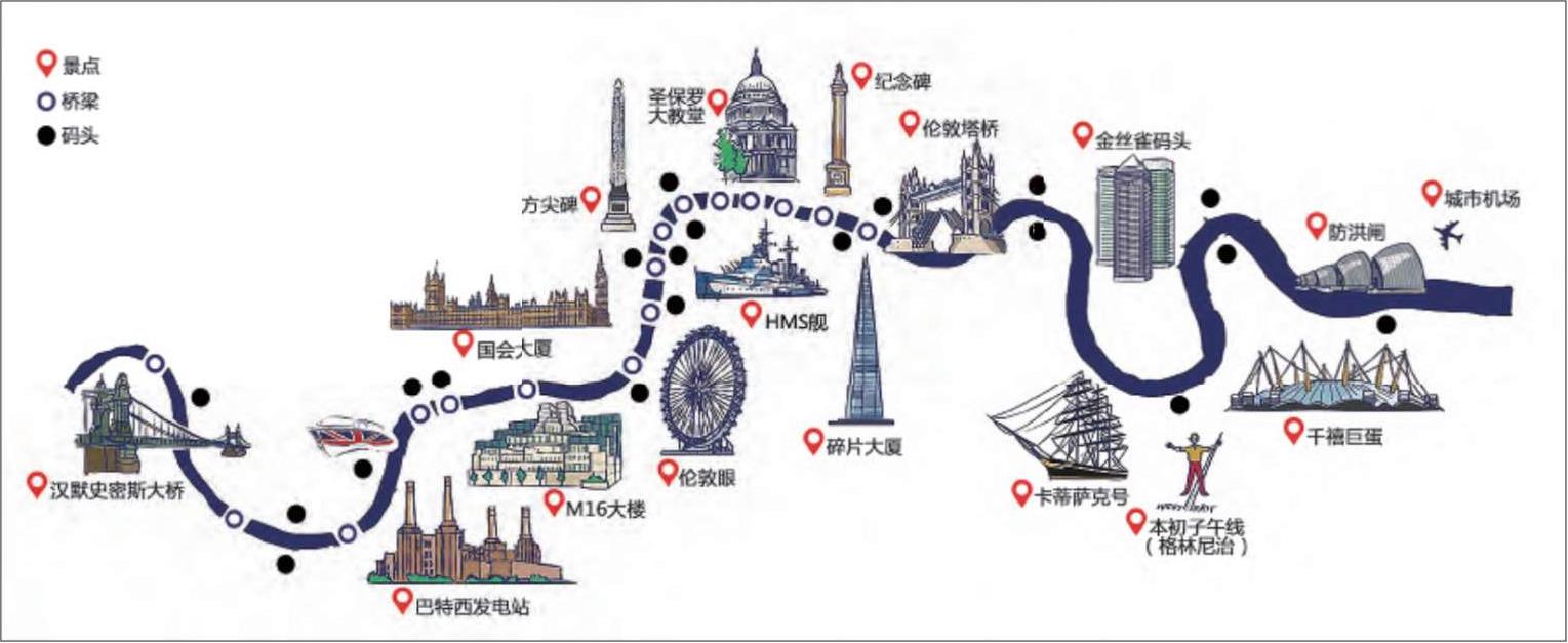 (图2.10)。根据牛津经济研究院(Oxford Economics)对泰晤士河(伦敦段)2014年年度经济影响力的统计结果,当年2 340万人游览了泰晤士河畔的景点,470万人在泰晤士河上参与乘船或其他水上娱乐活动;泰晤士河旅游业及相关行业共创造了约24亿英镑的经济价值;在附近区域提供了9.9万个与观光旅游相关的工作岗位