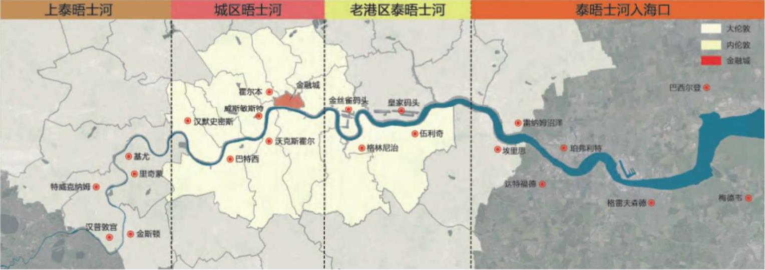 泰晤士河滨水空间的复兴过程与英国城市政策的发展密切相关。从20世纪40年代后期开始,河上的运输贸易减少,河畔仓库和码头被重新开发用作办公空间,然而河滨形成的宽阔的双车道自然阻断了行人接近河道的可能性。20世纪70年代,奉行新自由主义的保守党政府上台后,试图以经济改革促进社会转型。在此期间,泰晤士河滨水区的更新以提升当地经济发展、实现土地价值最大化为目标。到了20世纪90年代,随着美苏两大集团对抗格局的解体,全球社会经济形势走向了多元化与合作化,英国政府重新调整战略,转为倡导更面向全球经济竞争及基于可持续发展的“城市复兴”。在此背景下,泰晤士河沿岸空间被越来越多地视为城市公共空间的一部分,是提升城市中心区吸引力的重要元素。在大伦敦市域范围内,泰晤士河流经的欠发达城市区域被划定为泰晤士河政策区(Thames Policy Area),伦敦市政府在区域内大力加强保护生态环境、扩展旅游娱乐、改善城市形象等工作,以期将该区域重建为城市的“前门”(front door),达到促进城市复兴的战略目标 [17] 。建筑师特里·法雷尔(Terry Farrell)将泰晤士河流经大伦敦的区域分为四个区段:上泰晤士河(乡村地带)、城区泰晤士河、老港区泰晤士河及泰晤士河入海口 [18] (图2.5),其中城区段和老港区段是这一时期更新的重点,具体做法主要包括以下三部分。