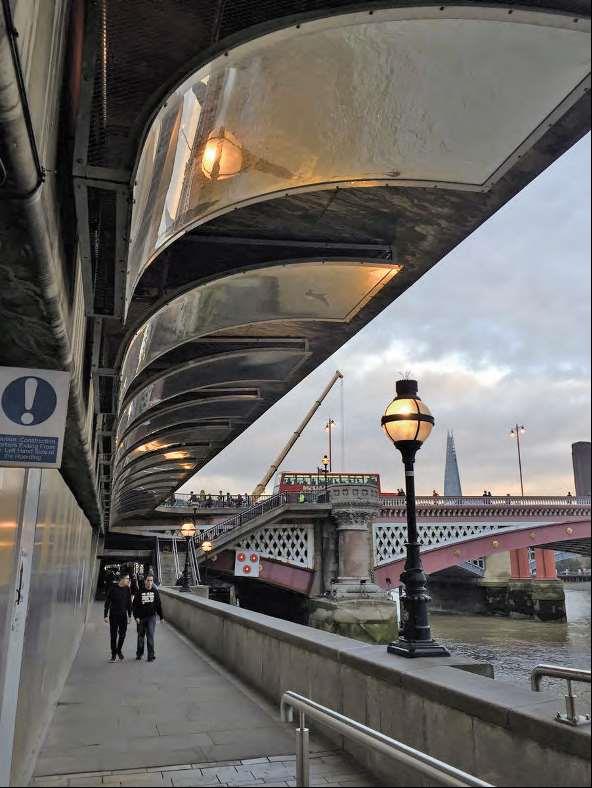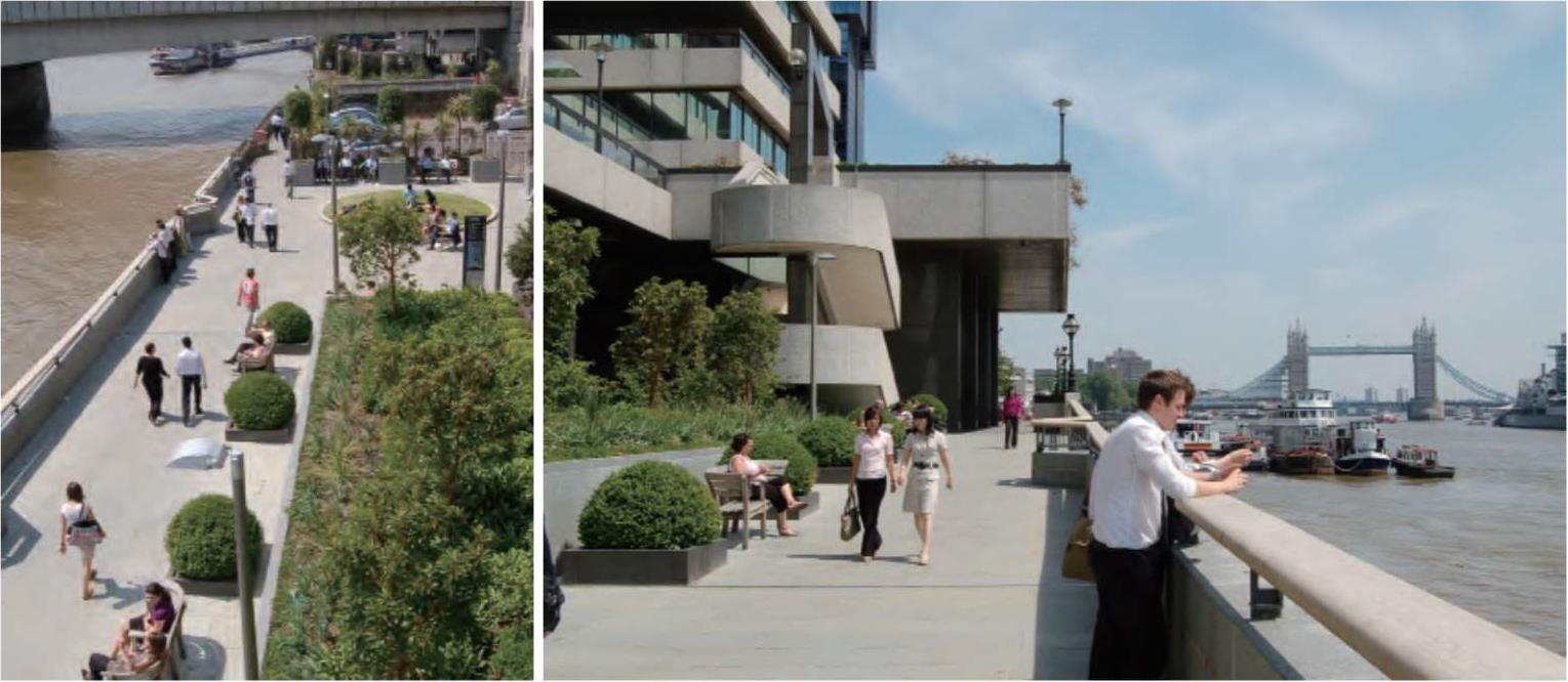 ③增强纵向连接。除了持续进行横向的步道建设以外,公共空间再造的另一个重点是加强城市腹地-滨水步道-滨水岸线三者之间的纵向连接。其中,泰晤士河北岸上、下街联通不畅一直是造成滨水空间纵向步行可达性差的主要障碍。为此,政府在若干关键道路节点打通步行联系。例如,在黑衣修士桥新增了人行横道,同时改善黑衣修士站的外部流线,使行人能安全、便捷地从城市腹地到达滨水步道 [23 ] 。此外,泰晤士河畔周边土地大部分为私人所有,但其前岸线通常被建设为开放性的步道、草坪或公园。这些公园的位置一般比岸线的防汛标高低,因此可再通过踏步、台阶等防汛设施与滨水步道连接,方便游客近水、亲水。