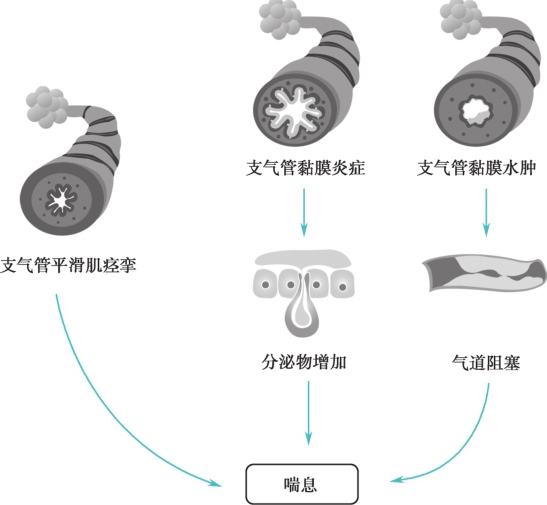 喘息即气喘,是呼吸困难的一种表现,患者主观上感受到空气不足,客观上表现为呼吸运动用力,常可闻及喘鸣音。喘息的发生与支气管平滑肌痉挛、支气管黏膜炎症所引起的分泌物增加及黏膜水肿所致的气道阻塞相关。喘息发生的病理过程,见图1-2。