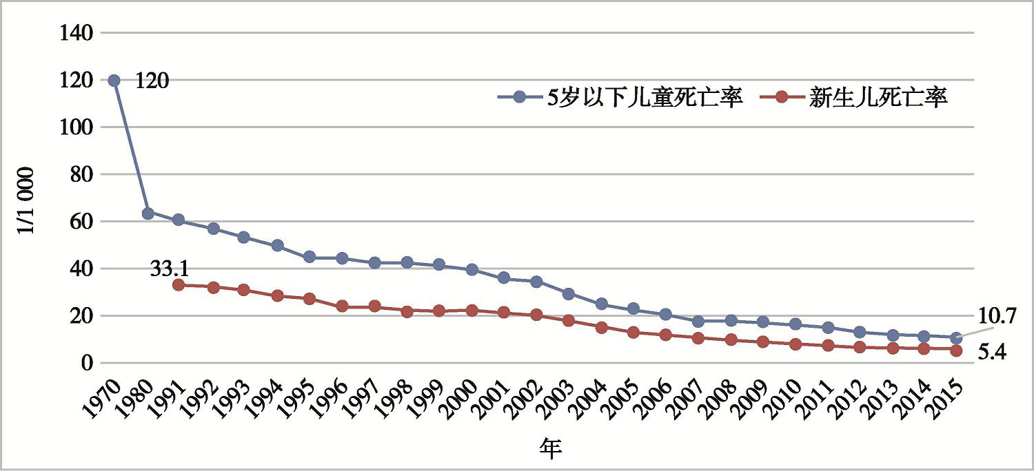 图1-4 1970—2015年5岁以下儿童死亡率和新生儿死亡率的变化情况。