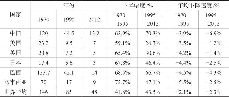 表1-2 不同时期、不同国家5岁以下儿童死亡率的下降情况