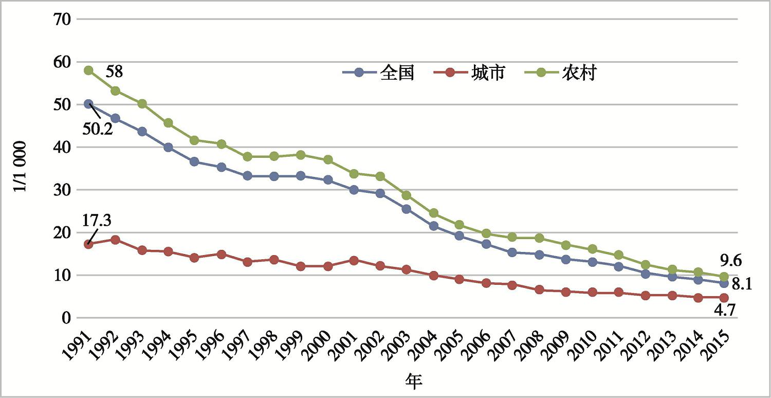 图1-3 1991—2015年婴儿死亡率的变化情况。