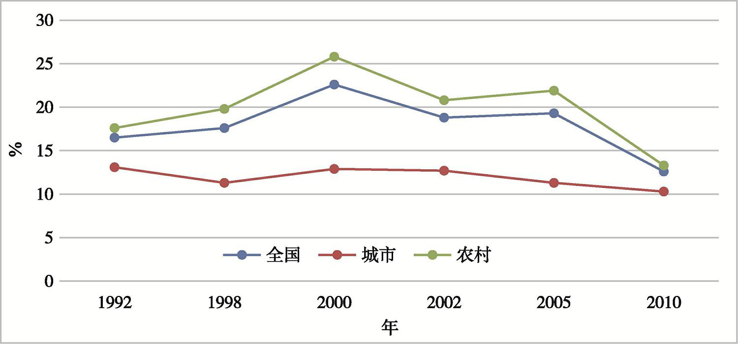 贫血,尤其是缺铁性贫血是中国5岁以下儿童最常见的营养缺乏性疾病。1992年至2005年中国城市和农村5岁以下儿童贫血患病率在12%~20%之间徘徊,没有明显改善 [26] 。2005年开始持续下降,从19.3%下降到2010年的12.6%,其中,城市由11.3%下降到10.3%;农村由21.9%下降到13.3%,农村下降幅度大于城市。但西部农村地区仍是儿童贫血的高发地区(图1-6)。有数据表明,2009年我国贫困农村地区2岁以下儿童贫血患病率在32.1%~42.3%之间,仍明显高于城市地区 [27] 。