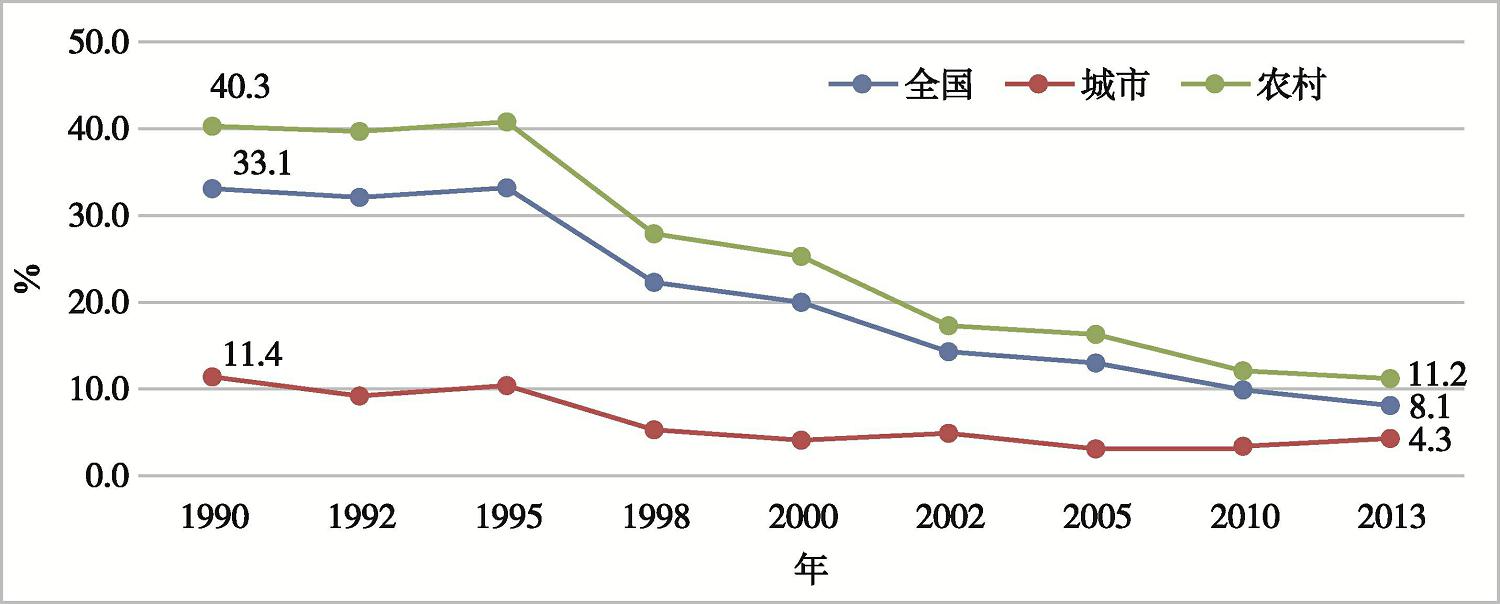 图1-5 1990—2013年5岁以下儿童生长迟缓率变化情况